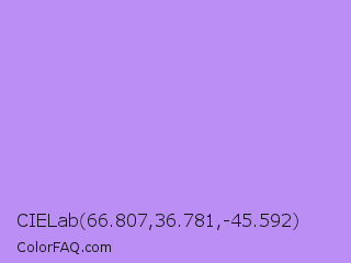 CIELab 66.807,36.781,-45.592 Color is a light violet color and the nearest color is Bright Lavender #bf94e4. Hex code #ba8ef5 and RGB value is rgb(186,142,245). In RGB color space, this color is composed of 73% red, 56% green, 96% blue, In CMYK color space, this color is composed of 24% cyan, 42% magenta, 0% yellow , 4% black , In HSL color space, this color has a hue angle of 266° , 84% saturation and 76% lightness.