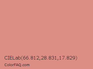 CIELab 66.812,28.831,17.829 Color is a light red color and the nearest color is My Pink #d69188. Hex code #dd8e84 and RGB value is rgb(221,142,132). In RGB color space, this color is composed of 87% red, 56% green, 52% blue, In CMYK color space, this color is composed of 0% cyan, 36% magenta, 40% yellow , 13% black , In HSL color space, this color has a hue angle of 7° , 57% saturation and 69% lightness.