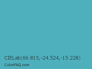 CIELab 66.815,-24.524,-15.228 Color is a normal cyan color and the nearest color is Fountain Blue #56b4be. Hex code #4fb0bd and RGB value is rgb(79,176,189). In RGB color space, this color is composed of 31% red, 69% green, 74% blue, In CMYK color space, this color is composed of 58% cyan, 7% magenta, 0% yellow , 26% black , In HSL color space, this color has a hue angle of 187° , 45% saturation and 53% lightness.