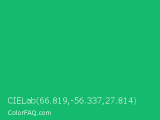 CIELab 66.819,-56.337,27.814 Color is a normal green color and the nearest color is Green Crayola #1cac78. Hex code #14ba6e and RGB value is rgb(20,186,110). In RGB color space, this color is composed of 8% red, 73% green, 43% blue, In CMYK color space, this color is composed of 89% cyan, 0% magenta, 41% yellow , 27% black , In HSL color space, this color has a hue angle of 153° , 81% saturation and 40% lightness.