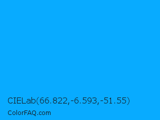 CIELab 66.822,-6.593,-51.55 Color is a normal blue color and the nearest color is Blue Bolt #00b9fb. Hex code #08abff and RGB value is rgb(8,171,255). In RGB color space, this color is composed of 3% red, 67% green, 100% blue, In CMYK color space, this color is composed of 97% cyan, 33% magenta, 0% yellow , 0% black , In HSL color space, this color has a hue angle of 200° , 100% saturation and 52% lightness.