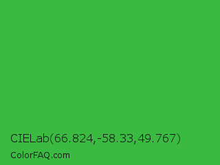 CIELab 66.824,-58.33,49.767 Color is a normal green color and the nearest color is Wageningen Green #34b233. Hex code #3aba41 and RGB value is rgb(58,186,65). In RGB color space, this color is composed of 23% red, 73% green, 25% blue, In CMYK color space, this color is composed of 69% cyan, 0% magenta, 65% yellow , 27% black , In HSL color space, this color has a hue angle of 123° , 52% saturation and 48% lightness.