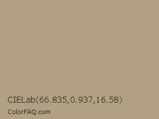 CIELab 66.835,0.937,16.58 Color is a light orange color and the nearest color is Hillary #aca586. Hex code #b0a185 and RGB value is rgb(176,161,133). In RGB color space, this color is composed of 69% red, 63% green, 52% blue, In CMYK color space, this color is composed of 0% cyan, 9% magenta, 24% yellow , 31% black , In HSL color space, this color has a hue angle of 39° , 21% saturation and 61% lightness.