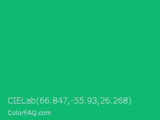 CIELab 66.847,-55.93,26.268 Color is a normal green color and the nearest color is Green Crayola #1cac78. Hex code #11ba71 and RGB value is rgb(17,186,113). In RGB color space, this color is composed of 7% red, 73% green, 44% blue, In CMYK color space, this color is composed of 91% cyan, 0% magenta, 39% yellow , 27% black , In HSL color space, this color has a hue angle of 154° , 83% saturation and 40% lightness.