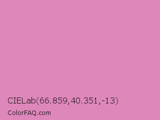 CIELab 66.859,40.351,-13 Color is a light magenta color and the nearest color is Middle Purple #d982b5. Hex code #de87bb and RGB value is rgb(222,135,187). In RGB color space, this color is composed of 87% red, 53% green, 73% blue, In CMYK color space, this color is composed of 0% cyan, 39% magenta, 16% yellow , 13% black , In HSL color space, this color has a hue angle of 324° , 57% saturation and 70% lightness.