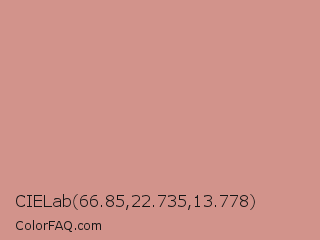 CIELab 66.85,22.735,13.778 Color is a light red color and the nearest color is My Pink #d69188. Hex code #d2938b and RGB value is rgb(210,147,139). In RGB color space, this color is composed of 82% red, 58% green, 55% blue, In CMYK color space, this color is composed of 0% cyan, 30% magenta, 34% yellow , 18% black , In HSL color space, this color has a hue angle of 7° , 44% saturation and 68% lightness.