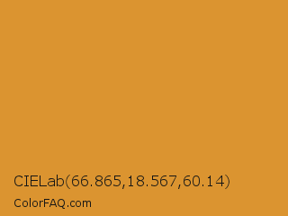 CIELab 66.865,18.567,60.14 Color is a normal orange color and the nearest color is Tigers Eye #e08d3c. Hex code #db9430 and RGB value is rgb(219,148,48). In RGB color space, this color is composed of 86% red, 58% green, 19% blue, In CMYK color space, this color is composed of 0% cyan, 32% magenta, 78% yellow , 14% black , In HSL color space, this color has a hue angle of 35° , 70% saturation and 52% lightness.