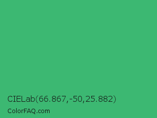 CIELab 66.867,-50,25.882 Color is a normal green color and the nearest color is Medium Sea Green #3cb371. Hex code #3cb872 and RGB value is rgb(60,184,114). In RGB color space, this color is composed of 24% red, 72% green, 45% blue, In CMYK color space, this color is composed of 67% cyan, 0% magenta, 38% yellow , 28% black , In HSL color space, this color has a hue angle of 146° , 51% saturation and 48% lightness.