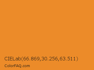 CIELab 66.869,30.256,63.511 Color is a normal orange color and the nearest color is Cadmium Orange #ed872d. Hex code #ec8b29 and RGB value is rgb(236,139,41). In RGB color space, this color is composed of 93% red, 55% green, 16% blue, In CMYK color space, this color is composed of 0% cyan, 41% magenta, 83% yellow , 7% black , In HSL color space, this color has a hue angle of 30° , 84% saturation and 54% lightness.