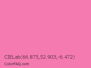CIELab 66.875,52.903,-6.472 Color is a light rose color and the nearest color is Tickle Me Pink Crayola #fc80a5. Hex code #f57ab0 and RGB value is rgb(245,122,176). In RGB color space, this color is composed of 96% red, 48% green, 69% blue, In CMYK color space, this color is composed of 0% cyan, 50% magenta, 28% yellow , 4% black , In HSL color space, this color has a hue angle of 334° , 86% saturation and 72% lightness.