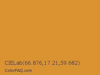 CIELab 66.876,17.21,59.682 Color is a normal orange color and the nearest color is Tigers Eye #e08d3c. Hex code #d99531 and RGB value is rgb(217,149,49). In RGB color space, this color is composed of 85% red, 58% green, 19% blue, In CMYK color space, this color is composed of 0% cyan, 31% magenta, 77% yellow , 15% black , In HSL color space, this color has a hue angle of 36° , 69% saturation and 52% lightness.