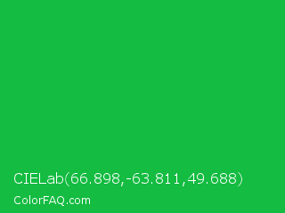 CIELab 66.898,-63.811,49.688 Color is a normal green color and the nearest color is Dark Pastel Green #03c03c. Hex code #14bc41 and RGB value is rgb(20,188,65). In RGB color space, this color is composed of 8% red, 74% green, 25% blue, In CMYK color space, this color is composed of 89% cyan, 0% magenta, 65% yellow , 26% black , In HSL color space, this color has a hue angle of 136° , 81% saturation and 41% lightness.