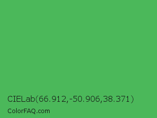 CIELab 66.912,-50.906,38.371 Color is a normal green color and the nearest color is Chateau Green #40a860. Hex code #4bb85a and RGB value is rgb(75,184,90). In RGB color space, this color is composed of 29% red, 72% green, 35% blue, In CMYK color space, this color is composed of 59% cyan, 0% magenta, 51% yellow , 28% black , In HSL color space, this color has a hue angle of 128° , 43% saturation and 51% lightness.