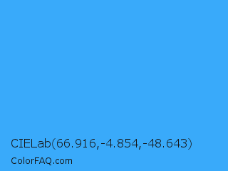 CIELab 66.916,-4.854,-48.643 Color is a normal blue color and the nearest color is Brilliant Azure #3399ff. Hex code #39aafa and RGB value is rgb(57,170,250). In RGB color space, this color is composed of 22% red, 67% green, 98% blue, In CMYK color space, this color is composed of 77% cyan, 32% magenta, 0% yellow , 2% black , In HSL color space, this color has a hue angle of 205° , 95% saturation and 60% lightness.