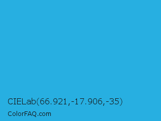 CIELab 66.921,-17.906,-35 Color is a normal blue color and the nearest color is Battery Charged Blue #1dacd6. Hex code #27afe1 and RGB value is rgb(39,175,225). In RGB color space, this color is composed of 15% red, 69% green, 88% blue, In CMYK color space, this color is composed of 83% cyan, 22% magenta, 0% yellow , 12% black , In HSL color space, this color has a hue angle of 196° , 76% saturation and 52% lightness.