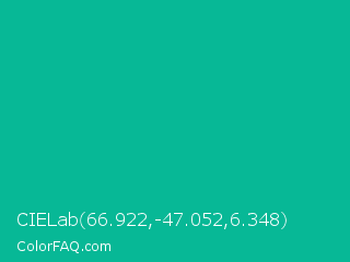 CIELab 66.922,-47.052,6.348 Color is a normal cyan color and the nearest color is Persian Green #00a693. Hex code #07b896 and RGB value is rgb(7,184,150). In RGB color space, this color is composed of 3% red, 72% green, 59% blue, In CMYK color space, this color is composed of 96% cyan, 0% magenta, 18% yellow , 28% black , In HSL color space, this color has a hue angle of 168° , 93% saturation and 37% lightness.