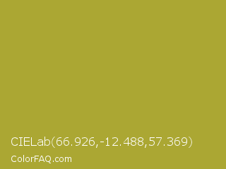 CIELab 66.926,-12.488,57.369 Color is a normal yellow color and the nearest color is Brass #b5a642. Hex code #aba733 and RGB value is rgb(171,167,51). In RGB color space, this color is composed of 67% red, 65% green, 20% blue, In CMYK color space, this color is composed of 0% cyan, 2% magenta, 70% yellow , 33% black , In HSL color space, this color has a hue angle of 58° , 54% saturation and 44% lightness.
