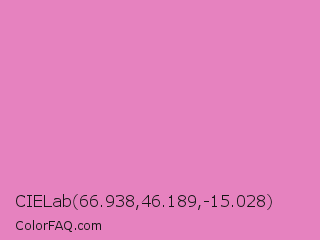 CIELab 66.938,46.189,-15.028 Color is a light magenta color and the nearest color is Middle Purple #d982b5. Hex code #e682bf and RGB value is rgb(230,130,191). In RGB color space, this color is composed of 90% red, 51% green, 75% blue, In CMYK color space, this color is composed of 0% cyan, 43% magenta, 17% yellow , 10% black , In HSL color space, this color has a hue angle of 323° , 67% saturation and 71% lightness.