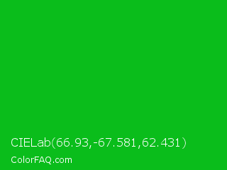 CIELab 66.93,-67.581,62.431 Color is a normal green color and the nearest color is Vivid Malachite #00cc33. Hex code #0abd1b and RGB value is rgb(10,189,27). In RGB color space, this color is composed of 4% red, 74% green, 11% blue, In CMYK color space, this color is composed of 95% cyan, 0% magenta, 86% yellow , 26% black , In HSL color space, this color has a hue angle of 126° , 90% saturation and 39% lightness.