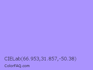 CIELab 66.953,31.857,-50.38 Color is a light indigo color and the nearest color is Dull Lavender #a899e6. Hex code #aa93fe and RGB value is rgb(170,147,254). In RGB color space, this color is composed of 67% red, 58% green, 100% blue, In CMYK color space, this color is composed of 33% cyan, 42% magenta, 0% yellow , 0% black , In HSL color space, this color has a hue angle of 253° , 98% saturation and 79% lightness.