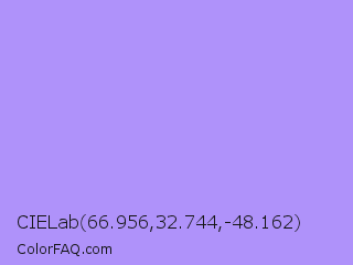CIELab 66.956,32.744,-48.162 Color is a light indigo color and the nearest color is Biloba Flower #b2a1ea. Hex code #af92fa and RGB value is rgb(175,146,250). In RGB color space, this color is composed of 69% red, 57% green, 98% blue, In CMYK color space, this color is composed of 30% cyan, 42% magenta, 0% yellow , 2% black , In HSL color space, this color has a hue angle of 257° , 91% saturation and 78% lightness.