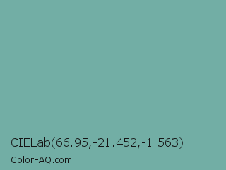 CIELab 66.95,-21.452,-1.563 Color is a normal cyan color and the nearest color is Green Sheen #6eaea1. Hex code #72aea5 and RGB value is rgb(114,174,165). In RGB color space, this color is composed of 45% red, 68% green, 65% blue, In CMYK color space, this color is composed of 34% cyan, 0% magenta, 5% yellow , 32% black , In HSL color space, this color has a hue angle of 171° , 27% saturation and 56% lightness.