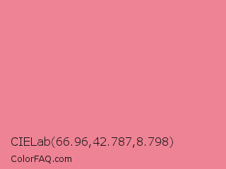 CIELab 66.96,42.787,8.798 Color is a light red color and the nearest color is Bright Blush #e47698. Hex code #ee8395 and RGB value is rgb(238,131,149). In RGB color space, this color is composed of 93% red, 51% green, 58% blue, In CMYK color space, this color is composed of 0% cyan, 45% magenta, 37% yellow , 7% black , In HSL color space, this color has a hue angle of 350° , 76% saturation and 72% lightness.