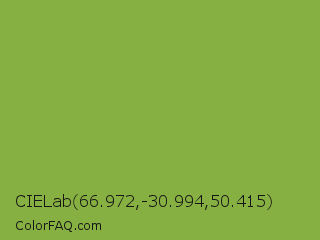 CIELab 66.972,-30.994,50.415 Color is a normal green color and the nearest color is Sushi #87ab39. Hex code #87b042 and RGB value is rgb(135,176,66). In RGB color space, this color is composed of 53% red, 69% green, 26% blue, In CMYK color space, this color is composed of 23% cyan, 0% magenta, 63% yellow , 31% black , In HSL color space, this color has a hue angle of 82° , 45% saturation and 47% lightness.