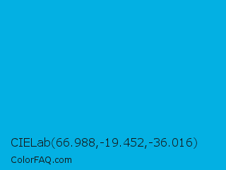 CIELab 66.988,-19.452,-36.016 Color is a normal blue color and the nearest color is Cyan Process #00b7eb. Hex code #03b0e3 and RGB value is rgb(3,176,227). In RGB color space, this color is composed of 1% red, 69% green, 89% blue, In CMYK color space, this color is composed of 99% cyan, 22% magenta, 0% yellow , 11% black , In HSL color space, this color has a hue angle of 194° , 97% saturation and 45% lightness.