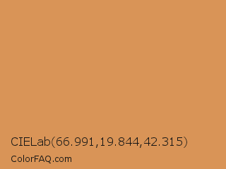 CIELab 66.991,19.844,42.315 Color is a normal orange color and the nearest color is Persian Orange #d99058. Hex code #d99457 and RGB value is rgb(217,148,87). In RGB color space, this color is composed of 85% red, 58% green, 34% blue, In CMYK color space, this color is composed of 0% cyan, 32% magenta, 60% yellow , 15% black , In HSL color space, this color has a hue angle of 28° , 63% saturation and 60% lightness.