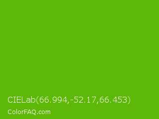 CIELab 66.994,-52.17,66.453 Color is a normal green color and the nearest color is Christi #67a712. Hex code #5db807 and RGB value is rgb(93,184,7). In RGB color space, this color is composed of 36% red, 72% green, 3% blue, In CMYK color space, this color is composed of 49% cyan, 0% magenta, 96% yellow , 28% black , In HSL color space, this color has a hue angle of 91° , 93% saturation and 37% lightness.