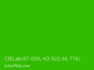 CIELab 67.009,-63.922,66.776 Color is a normal green color and the nearest color is Harlequin Green #46cb18. Hex code #32bc00 and RGB value is rgb(50,188,0). In RGB color space, this color is composed of 20% red, 74% green, 0% blue, In CMYK color space, this color is composed of 73% cyan, 0% magenta, 100% yellow , 26% black , In HSL color space, this color has a hue angle of 104° , 100% saturation and 37% lightness.