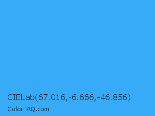 CIELab 67.016,-6.666,-46.856 Color is a normal blue color and the nearest color is Brilliant Azure #3399ff. Hex code #37abf7 and RGB value is rgb(55,171,247). In RGB color space, this color is composed of 22% red, 67% green, 97% blue, In CMYK color space, this color is composed of 78% cyan, 31% magenta, 0% yellow , 3% black , In HSL color space, this color has a hue angle of 204° , 92% saturation and 59% lightness.