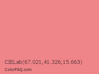 CIELab 67.021,41.326,15.663 Color is a light red color and the nearest color is Light Coral #f08080. Hex code #ef8489 and RGB value is rgb(239,132,137). In RGB color space, this color is composed of 94% red, 52% green, 54% blue, In CMYK color space, this color is composed of 0% cyan, 45% magenta, 43% yellow , 6% black , In HSL color space, this color has a hue angle of 357° , 77% saturation and 73% lightness.