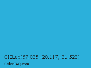 CIELab 67.035,-20.117,-31.523 Color is a normal blue color and the nearest color is Battery Charged Blue #1dacd6. Hex code #2bb0db and RGB value is rgb(43,176,219). In RGB color space, this color is composed of 17% red, 69% green, 86% blue, In CMYK color space, this color is composed of 80% cyan, 20% magenta, 0% yellow , 14% black , In HSL color space, this color has a hue angle of 195° , 71% saturation and 51% lightness.