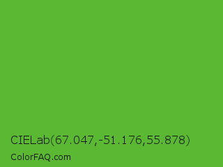CIELab 67.047,-51.176,55.878 Color is a normal green color and the nearest color is Green RYB #66b032. Hex code #5ab833 and RGB value is rgb(90,184,51). In RGB color space, this color is composed of 35% red, 72% green, 20% blue, In CMYK color space, this color is composed of 51% cyan, 0% magenta, 72% yellow , 28% black , In HSL color space, this color has a hue angle of 102° , 57% saturation and 46% lightness.