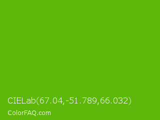CIELab 67.04,-51.789,66.032 Color is a normal green color and the nearest color is Christi #67a712. Hex code #5eb80b and RGB value is rgb(94,184,11). In RGB color space, this color is composed of 37% red, 72% green, 4% blue, In CMYK color space, this color is composed of 49% cyan, 0% magenta, 94% yellow , 28% black , In HSL color space, this color has a hue angle of 91° , 89% saturation and 38% lightness.