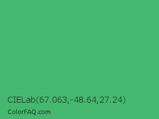 CIELab 67.063,-48.64,27.24 Color is a normal green color and the nearest color is Medium Sea Green #3cb371. Hex code #45b870 and RGB value is rgb(69,184,112). In RGB color space, this color is composed of 27% red, 72% green, 44% blue, In CMYK color space, this color is composed of 63% cyan, 0% magenta, 39% yellow , 28% black , In HSL color space, this color has a hue angle of 142° , 45% saturation and 50% lightness.
