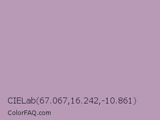 CIELab 67.067,16.242,-10.861 Color is a light magenta color and the nearest color is Pastel Purple #b39eb5. Hex code #b89ab7 and RGB value is rgb(184,154,183). In RGB color space, this color is composed of 72% red, 60% green, 72% blue, In CMYK color space, this color is composed of 0% cyan, 16% magenta, 1% yellow , 28% black , In HSL color space, this color has a hue angle of 302° , 17% saturation and 66% lightness.