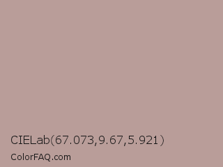 CIELab 67.073,9.67,5.921 Color is a light red color and the nearest color is Thatch #b69d98. Hex code #b99d99 and RGB value is rgb(185,157,153). In RGB color space, this color is composed of 73% red, 62% green, 60% blue, In CMYK color space, this color is composed of 0% cyan, 15% magenta, 17% yellow , 27% black , In HSL color space, this color has a hue angle of 8° , 19% saturation and 66% lightness.