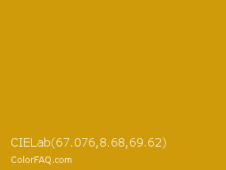 CIELab 67.076,8.68,69.62 Color is a normal orange color and the nearest color is Vivid Amber #cc9900. Hex code #cf9b0b and RGB value is rgb(207,155,11). In RGB color space, this color is composed of 81% red, 61% green, 4% blue, In CMYK color space, this color is composed of 0% cyan, 25% magenta, 95% yellow , 19% black , In HSL color space, this color has a hue angle of 44° , 90% saturation and 43% lightness.