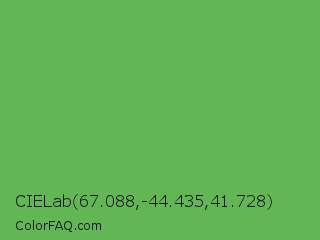CIELab 67.088,-44.435,41.728 Color is a normal green color and the nearest color is Fern #63b76c. Hex code #63b654 and RGB value is rgb(99,182,84). In RGB color space, this color is composed of 39% red, 71% green, 33% blue, In CMYK color space, this color is composed of 46% cyan, 0% magenta, 54% yellow , 29% black , In HSL color space, this color has a hue angle of 111° , 40% saturation and 52% lightness.