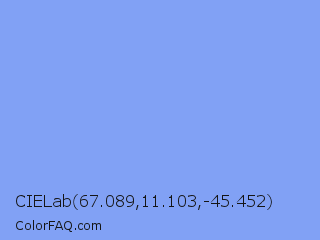 CIELab 67.089,11.103,-45.452 Color is a light blue color and the nearest color is Portage #8b9fee. Hex code #81a1f5 and RGB value is rgb(129,161,245). In RGB color space, this color is composed of 51% red, 63% green, 96% blue, In CMYK color space, this color is composed of 47% cyan, 34% magenta, 0% yellow , 4% black , In HSL color space, this color has a hue angle of 223° , 85% saturation and 73% lightness.