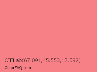 CIELab 67.091,45.553,17.592 Color is a light red color and the nearest color is Light Coral #f08080. Hex code #f68086 and RGB value is rgb(246,128,134). In RGB color space, this color is composed of 96% red, 50% green, 53% blue, In CMYK color space, this color is composed of 0% cyan, 48% magenta, 46% yellow , 4% black , In HSL color space, this color has a hue angle of 357° , 87% saturation and 73% lightness.