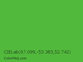 CIELab 67.099,-53.383,52.742 Color is a normal green color and the nearest color is Apple #4fa83d. Hex code #51b93b and RGB value is rgb(81,185,59). In RGB color space, this color is composed of 32% red, 73% green, 23% blue, In CMYK color space, this color is composed of 56% cyan, 0% magenta, 68% yellow , 27% black , In HSL color space, this color has a hue angle of 110° , 52% saturation and 48% lightness.