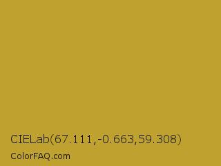 CIELab 67.111,-0.663,59.308 Color is a normal yellow color and the nearest color is Hokey Pokey #c8a528. Hex code #bfa130 and RGB value is rgb(191,161,48). In RGB color space, this color is composed of 75% red, 63% green, 19% blue, In CMYK color space, this color is composed of 0% cyan, 16% magenta, 75% yellow , 25% black , In HSL color space, this color has a hue angle of 47° , 60% saturation and 47% lightness.