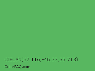 CIELab 67.116,-46.37,35.713 Color is a normal green color and the nearest color is Fern #63b76c. Hex code #58b760 and RGB value is rgb(88,183,96). In RGB color space, this color is composed of 35% red, 72% green, 38% blue, In CMYK color space, this color is composed of 52% cyan, 0% magenta, 48% yellow , 28% black , In HSL color space, this color has a hue angle of 125° , 40% saturation and 53% lightness.