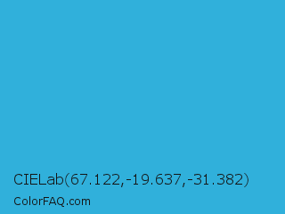 CIELab 67.122,-19.637,-31.382 Color is a normal blue color and the nearest color is Scooter #2ebfd4. Hex code #30b0db and RGB value is rgb(48,176,219). In RGB color space, this color is composed of 19% red, 69% green, 86% blue, In CMYK color space, this color is composed of 78% cyan, 20% magenta, 0% yellow , 14% black , In HSL color space, this color has a hue angle of 195° , 70% saturation and 52% lightness.