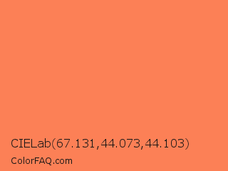 CIELab 67.131,44.073,44.103 Color is a light color and the nearest color is Coral #ff7f50. Hex code #fc8056 and RGB value is rgb(252,128,86). In RGB color space, this color is composed of 99% red, 50% green, 34% blue, In CMYK color space, this color is composed of 0% cyan, 49% magenta, 66% yellow , 1% black , In HSL color space, this color has a hue angle of 15° , 97% saturation and 66% lightness.