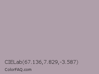 CIELab 67.136,7.829,-3.587 Color is a light magenta color and the nearest color is Lilac Luster #ae98aa. Hex code #af9faa and RGB value is rgb(175,159,170). In RGB color space, this color is composed of 69% red, 62% green, 67% blue, In CMYK color space, this color is composed of 0% cyan, 9% magenta, 3% yellow , 31% black , In HSL color space, this color has a hue angle of 319° , 9% saturation and 65% lightness.